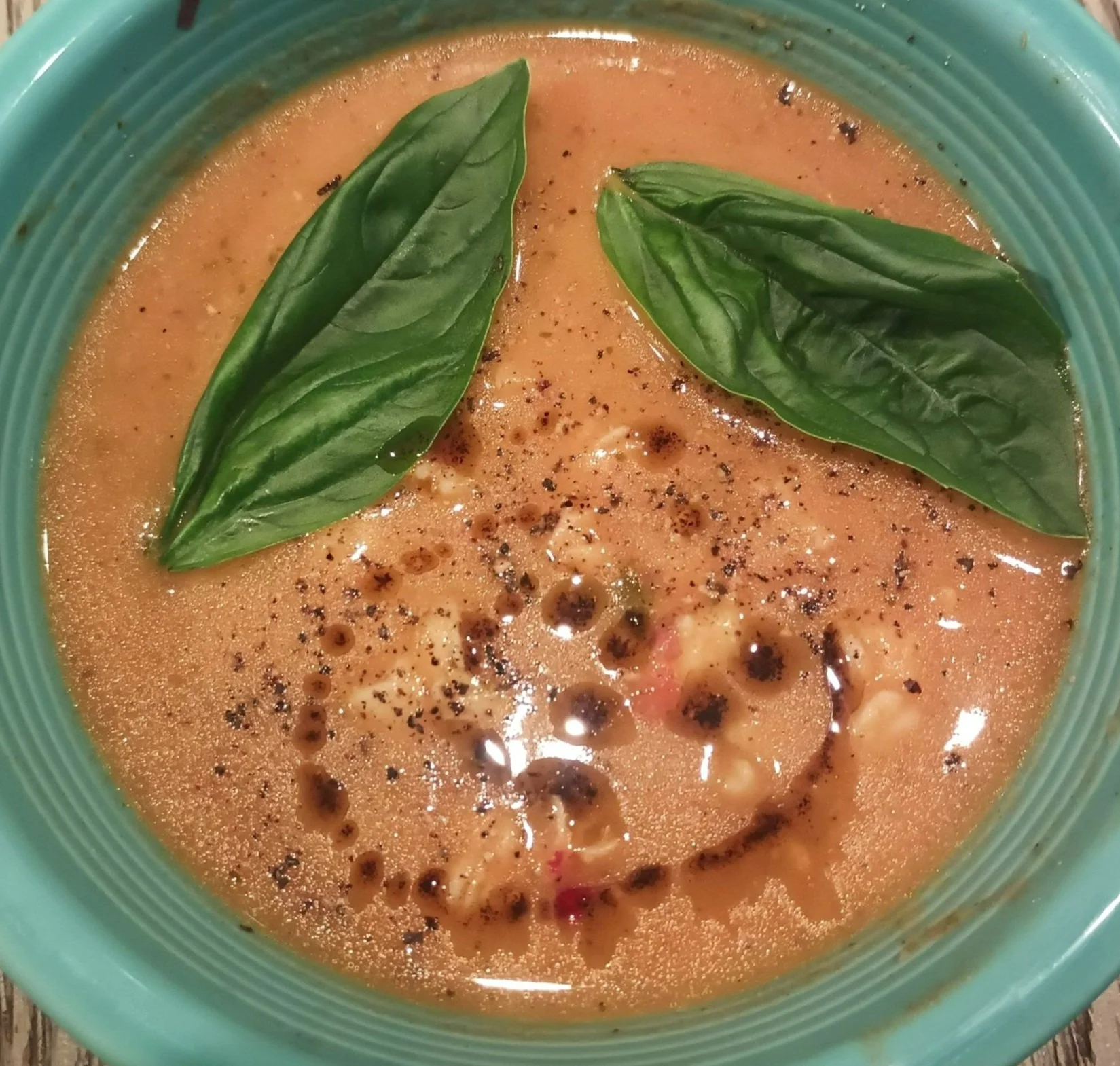 Lobster bisque with Evening Song Farm tomatoes, potatoes, celery, onions, garlic, fennel, basil, sage butter, and goat milk, with local lobster.
