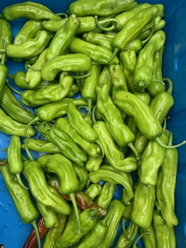 Fruiting Crops: slicing cucumbers, Japanese cucumbers, heirloom tomatoes, beefsteak tomatoes, cherry tomatoes, roma tomatoes, tomatillos, shishito peppers, sweet Italian Carmen peppers, red bell peppers, jalapeno peppers, spaghetti squash, husk cherries, green beans