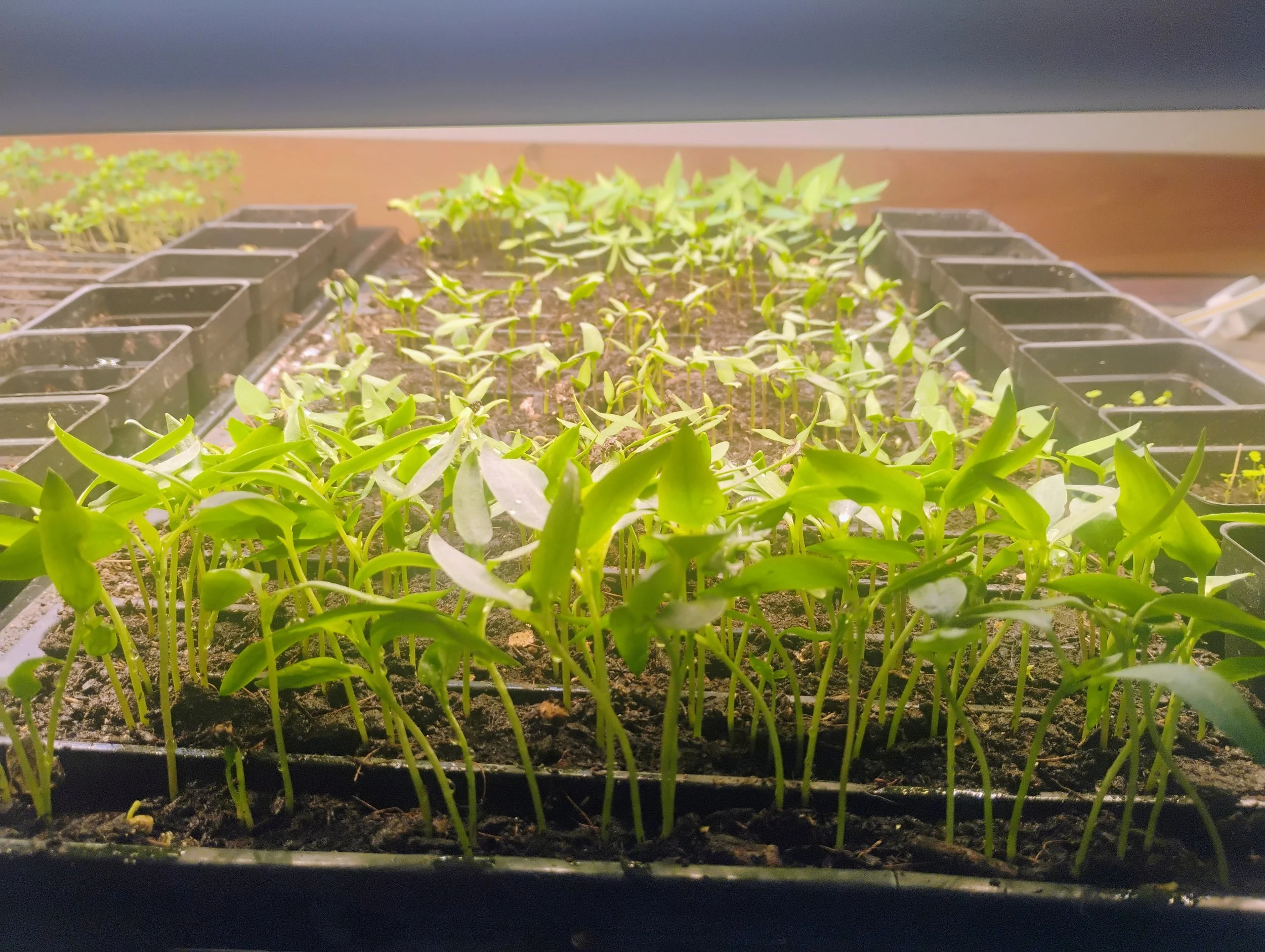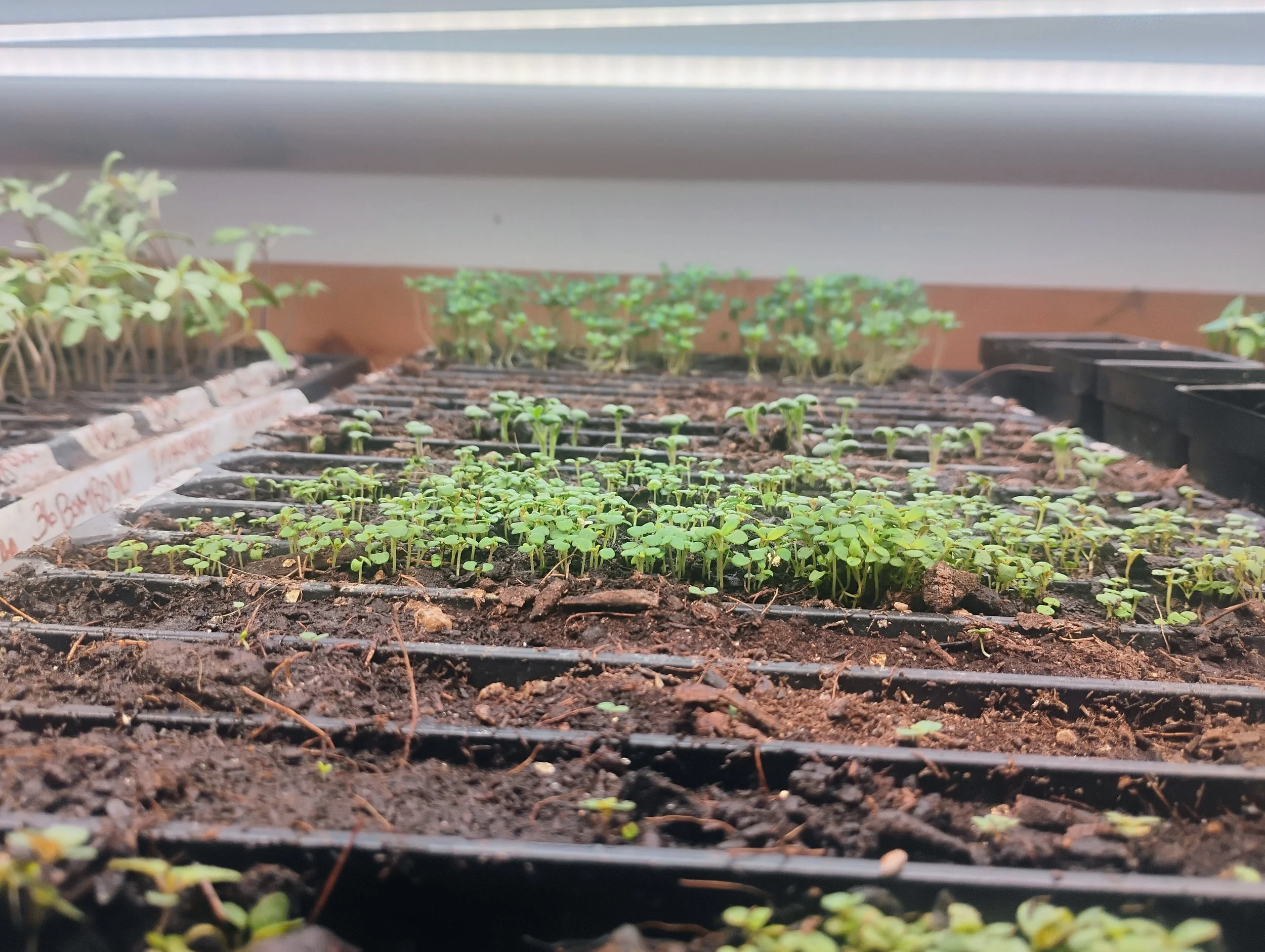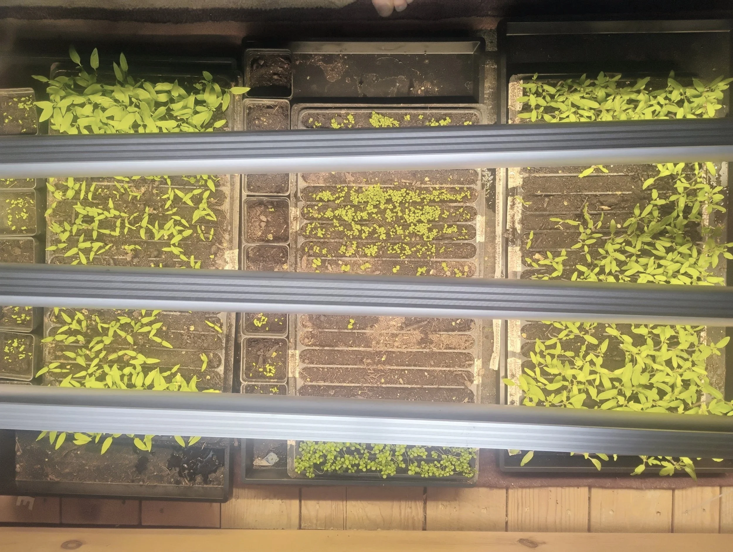 Looking down over the trays through the grow lights hanging over them. We save so much energy just using less than 6 square feet to start all these, photo by Kara