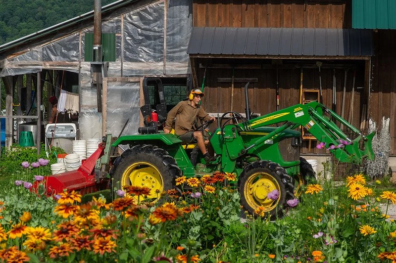 Ryan driving the tractor past the pick-your-own flower garden, photo by Adam Ford