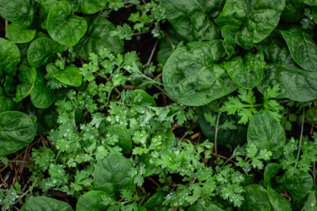Greens: green curly kale, spinach, baby lettuce, claytonia, baby chard, green cabbage