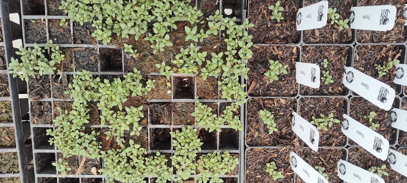 thyme plants getting potted up to their bigger containers, photo by Kara