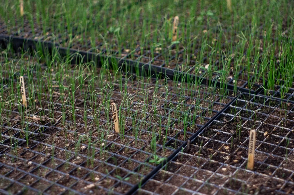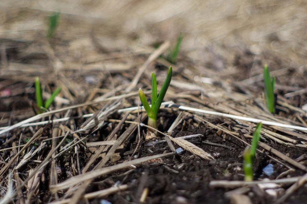 garlic poking through the soil and mulch is a favorite spring sighting, photo by Adam Ford