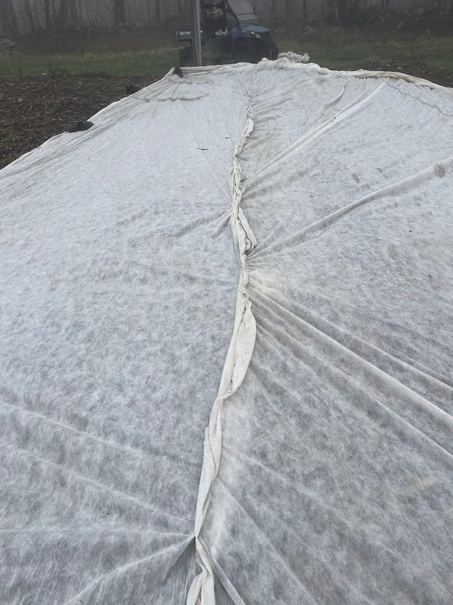 When row cover rips, it feels so good to get to repair it with a battery powered handheld sewing machine, photo by Ryan