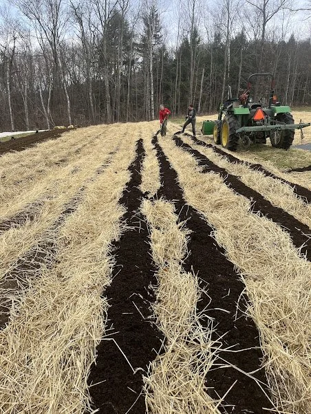 Leah and Natalie prepping ridges with straw mulch and compost for transplanting, photo by Ryan