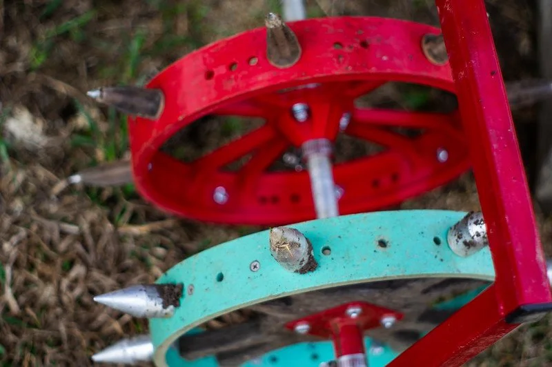 we use this rolling dibbler to mark where transplants go in a bed, photo by Adam Ford