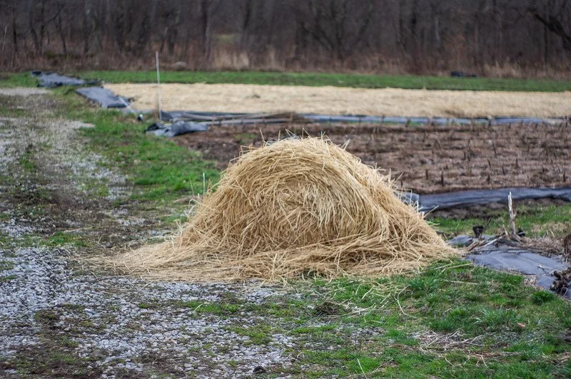 partial strawbale waiting to be unrolled as mulch, photo by Adam Ford