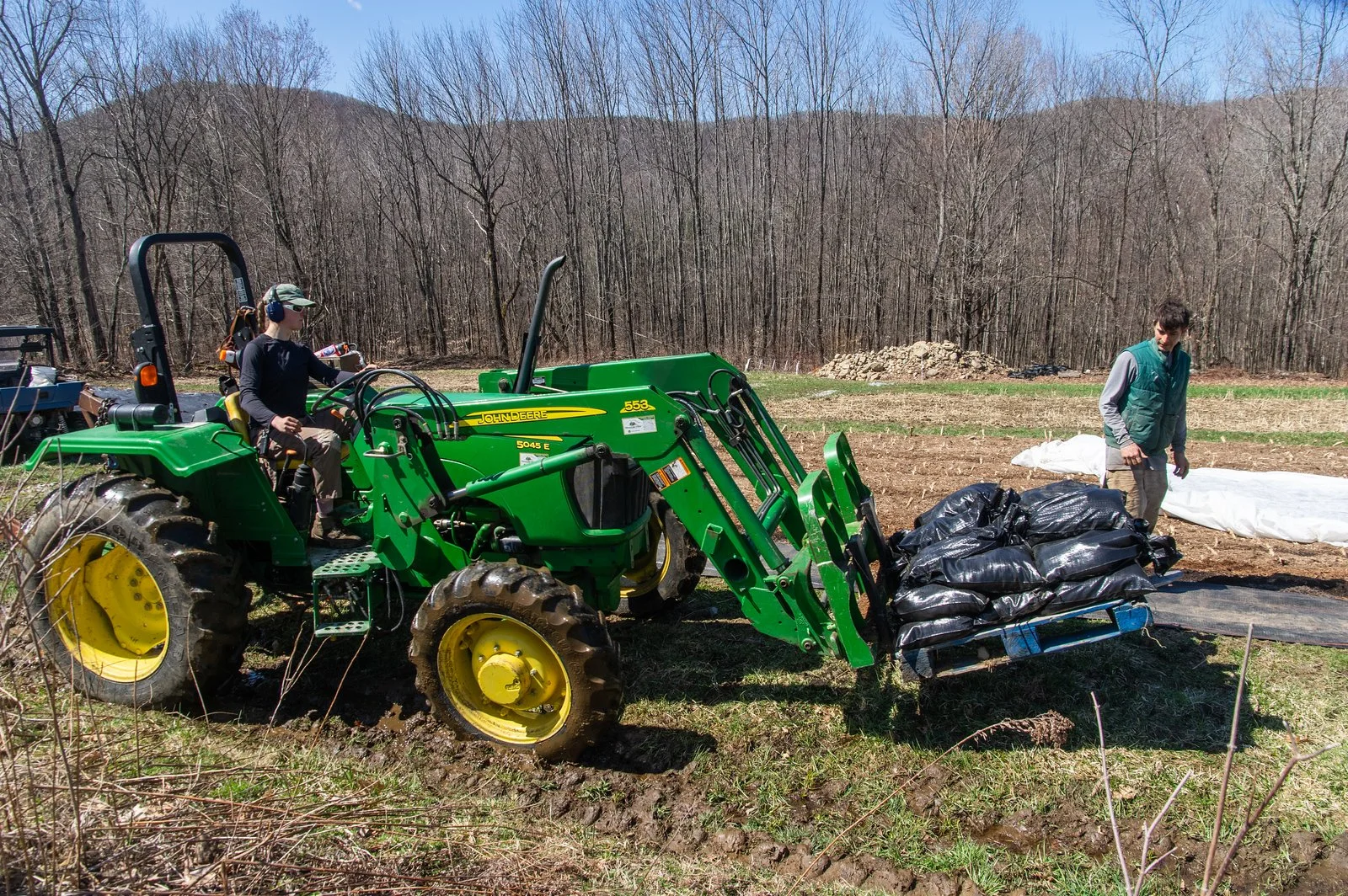 Leah and Ryan setting out sandbags to hold row cover over the freshly planted outdoor sugarsnap peas, photo by Adam Ford